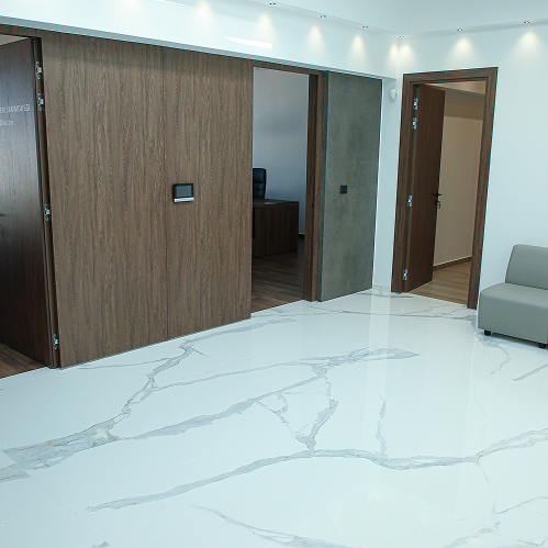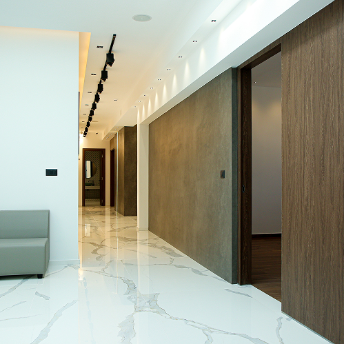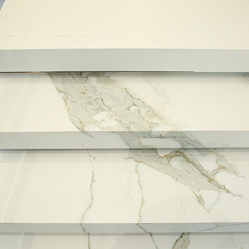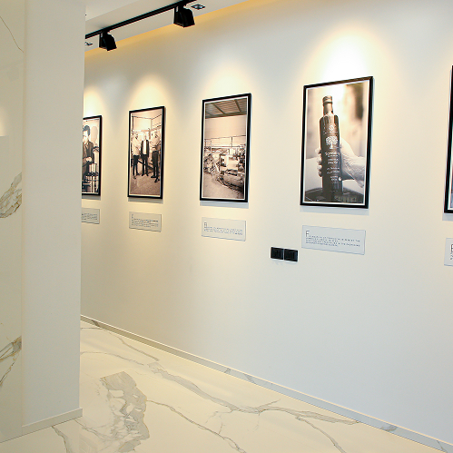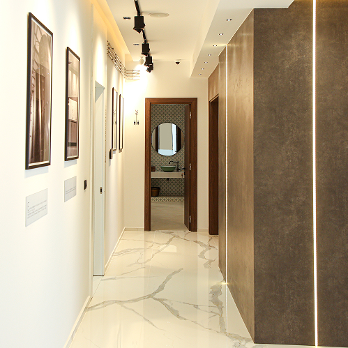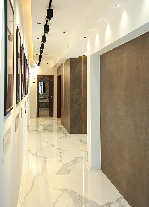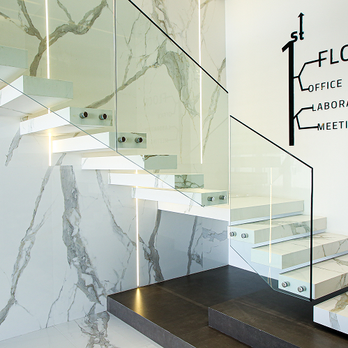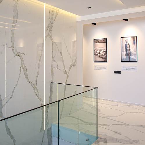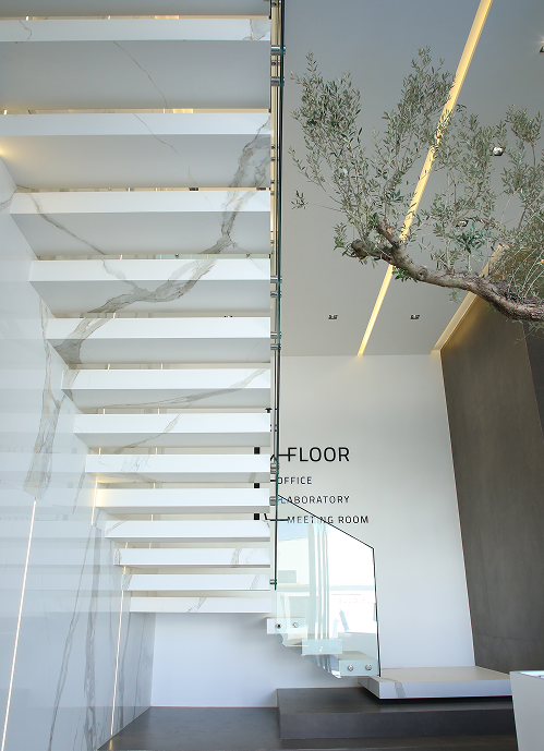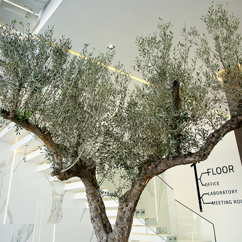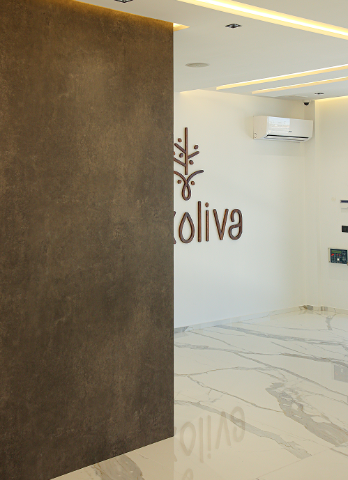 Nous avons recommandé la surface Michelangelo Brillant de Laminam, un matériau premium traversé de veines élégantes, inspirées par les lignes naturelles et sinueuses des racines d’olivier. Ce choix crée une ambiance raffinée, lumineuse et élégante, offrant un rendu haut de gamme parfaitement adapté à l’identité de l’huilerie.