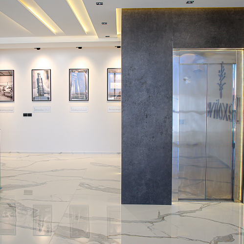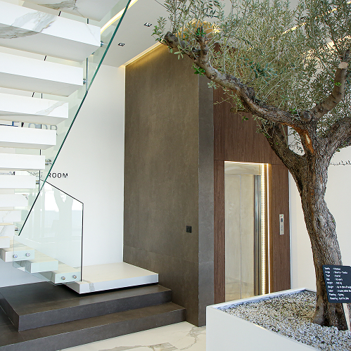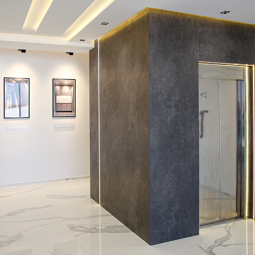 La cabine d’ascenseur a été habillée en Fokos Piombo, une finition élégante et contemporaine.