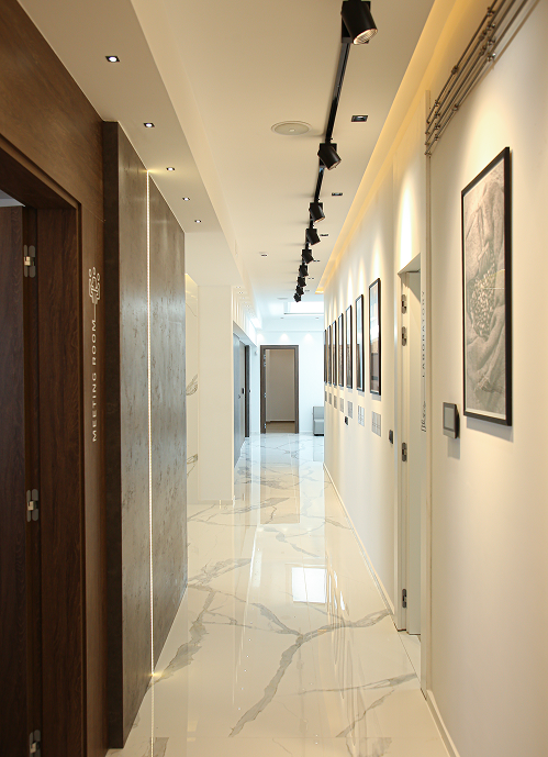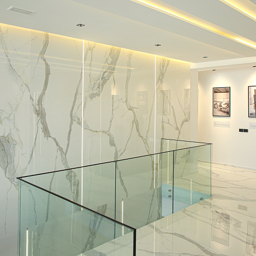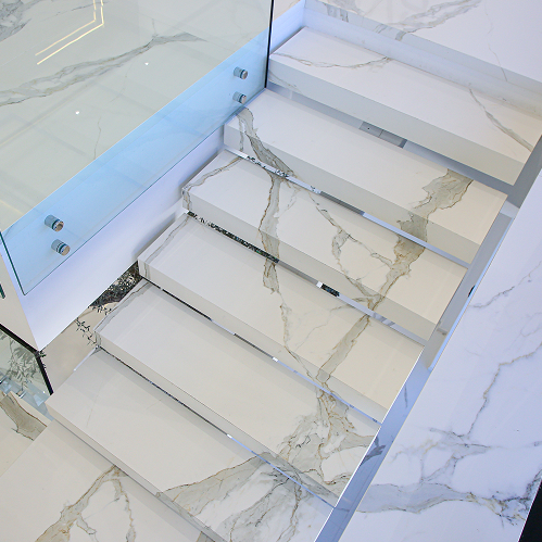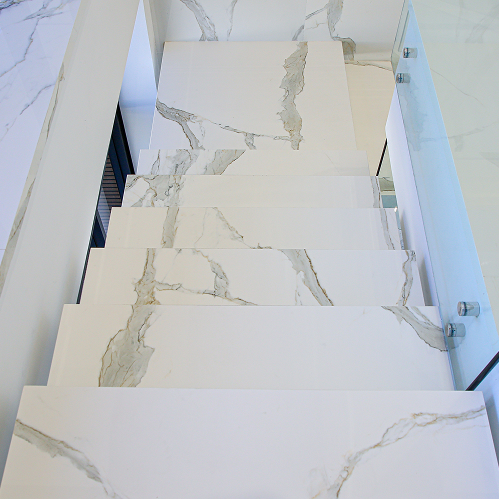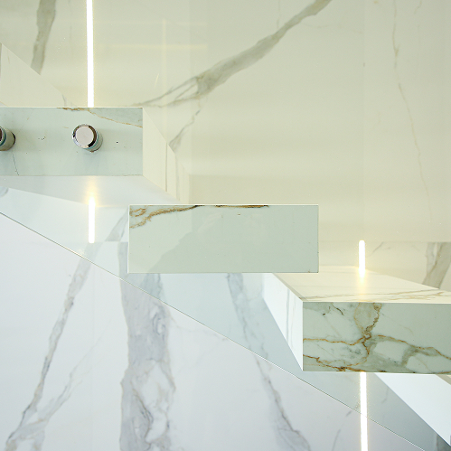 Pour garantir une cohérence esthétique totale, l’escalier a été conçu dans la même référence Michelangelo, mais en finition Matt, idéale pour ses propriétés antidérapantes.