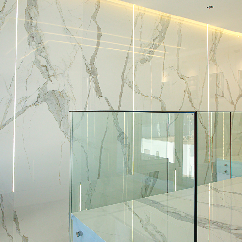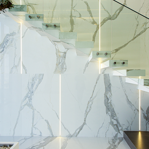 • Un revêtement de sol, mural et d’escalier avec une référence inspirée des racines de l’olivier, alliant veines naturelles et blancheur lumineuse.
