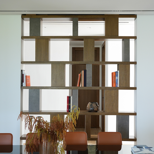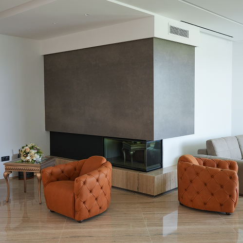 - Habillage de la cheminée et du box de la bibliothèque en Fokos Piombo, assurant une cohérence esthétique dans l’espace de vie.