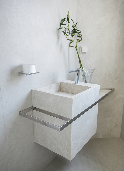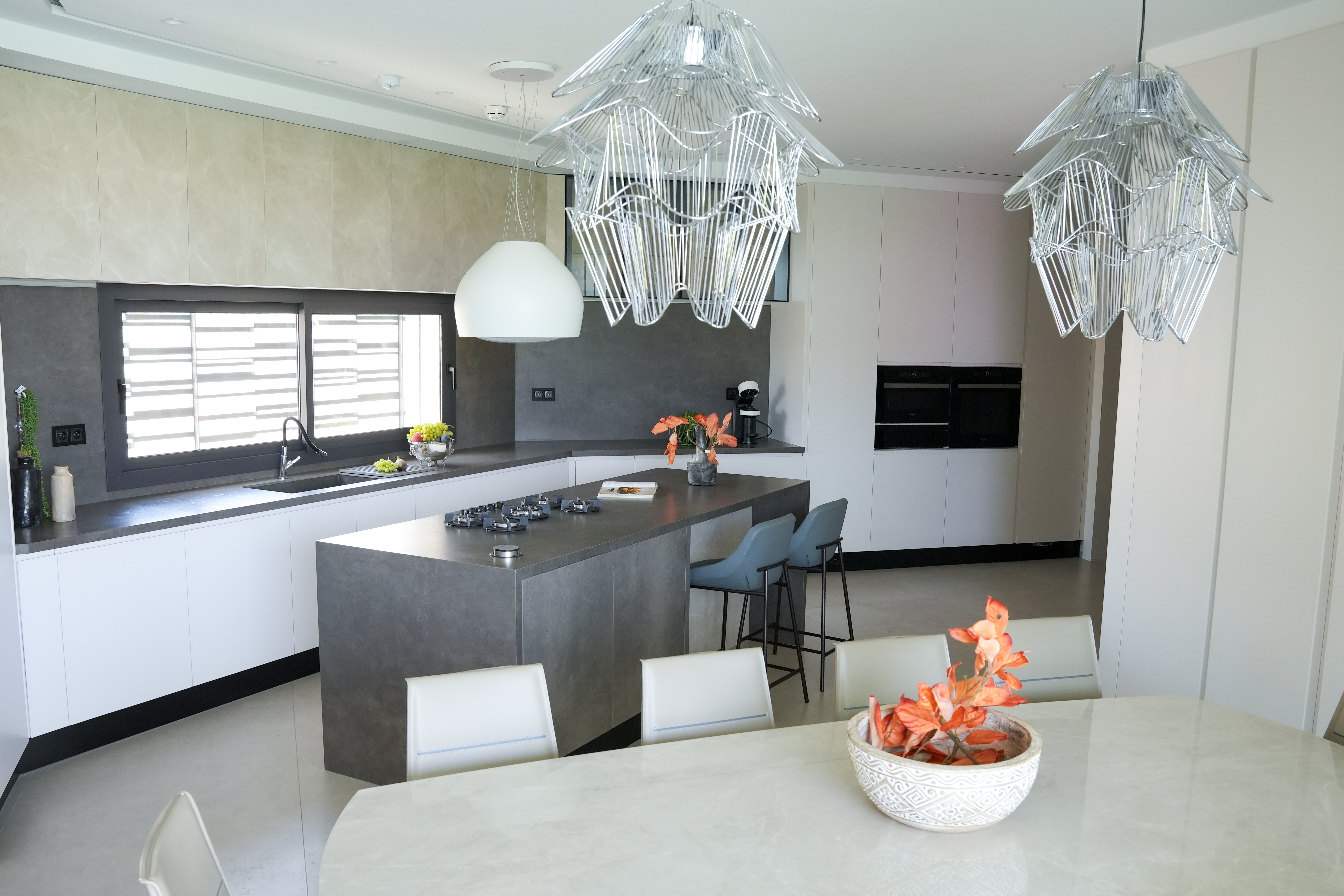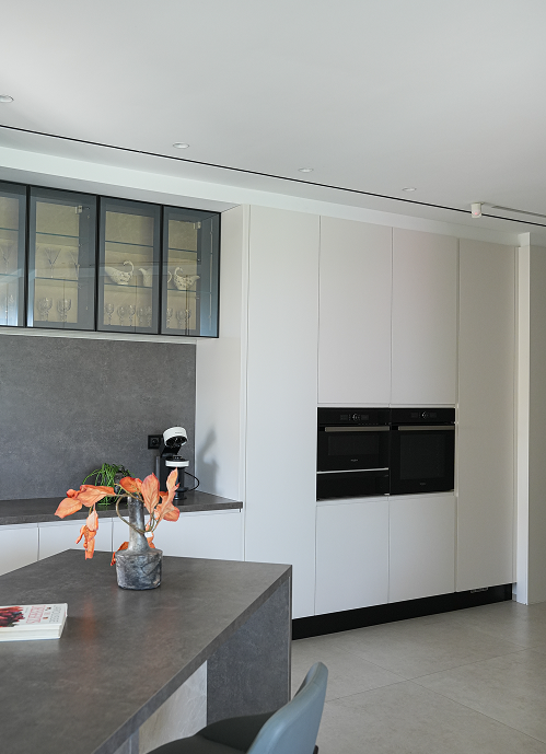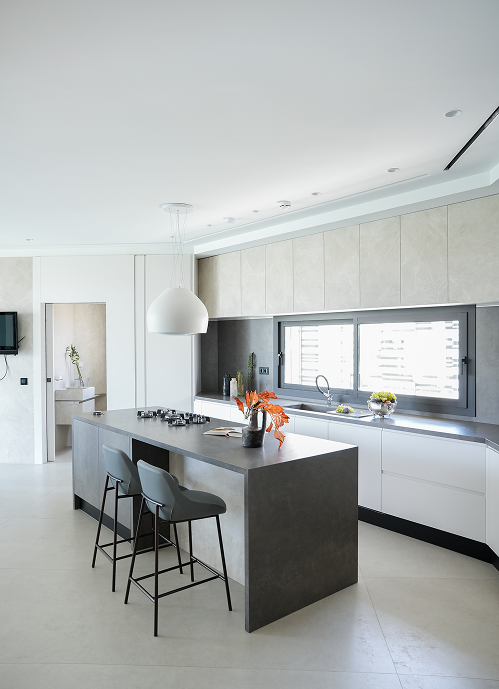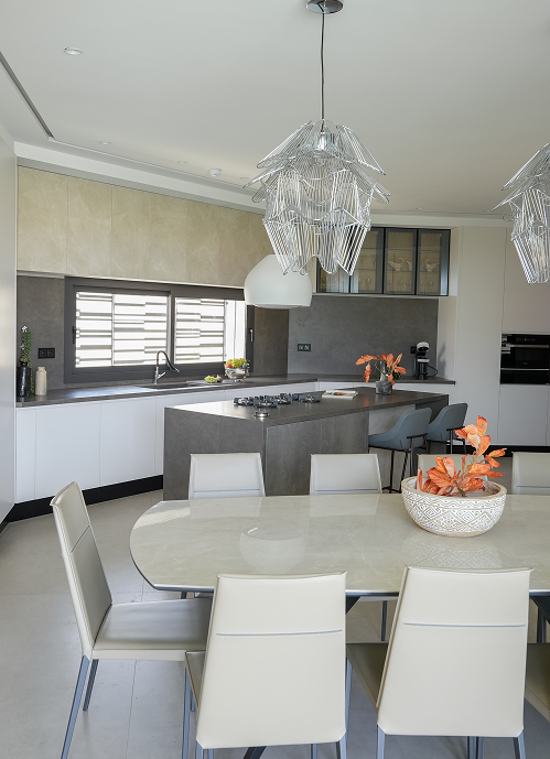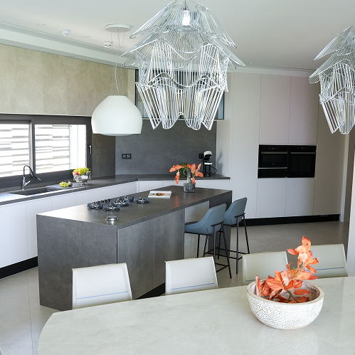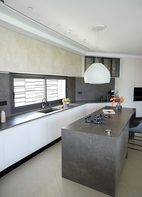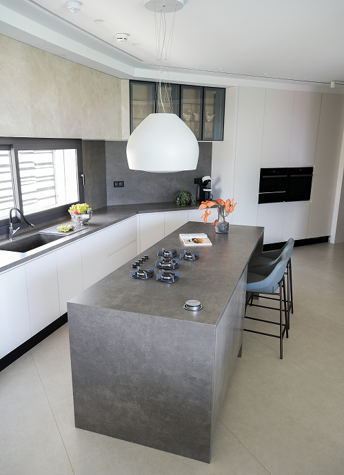 - Crédence de cuisine assortie au plan de travail, également en Fokos Piombo, pour une continuité visuelle parfaite.