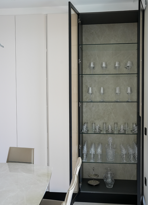 - Façades de cuisine élement Haut et fond de niche vitré réalisées en Diamond Cream Mat, offrant un contraste doux et lumineux.